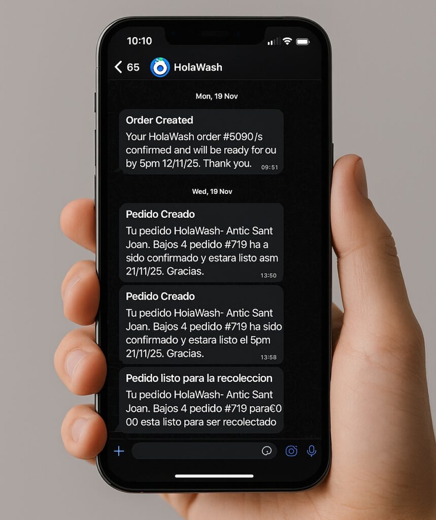 Persones reals són aquí per a vosaltres — en qualsevol moment. Rebeu notificacions instantànies per WhatsApp tan bon punt feu una comanda, a més d'actualitzacions en directe sobre la recollida, la neteja i la lliurament. Necessites ajuda? El nostre equip d'assistència respon ràpidament, de dia o de nit.